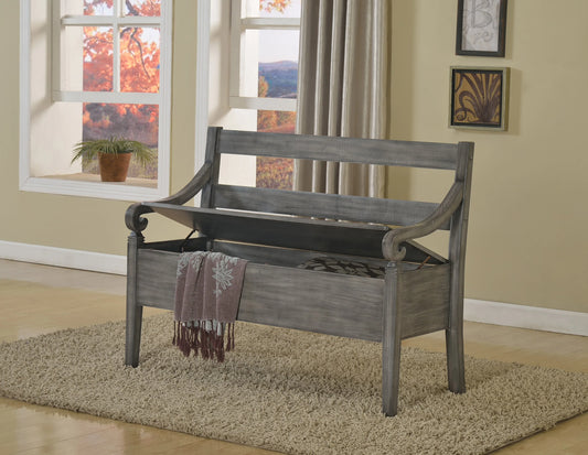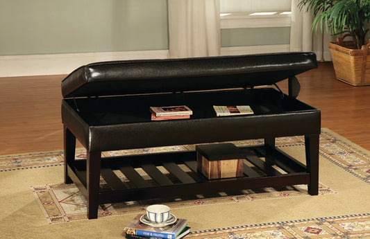 Espresso finish wood bedroom bench with upholstered seat and flip top storage and lower shelf