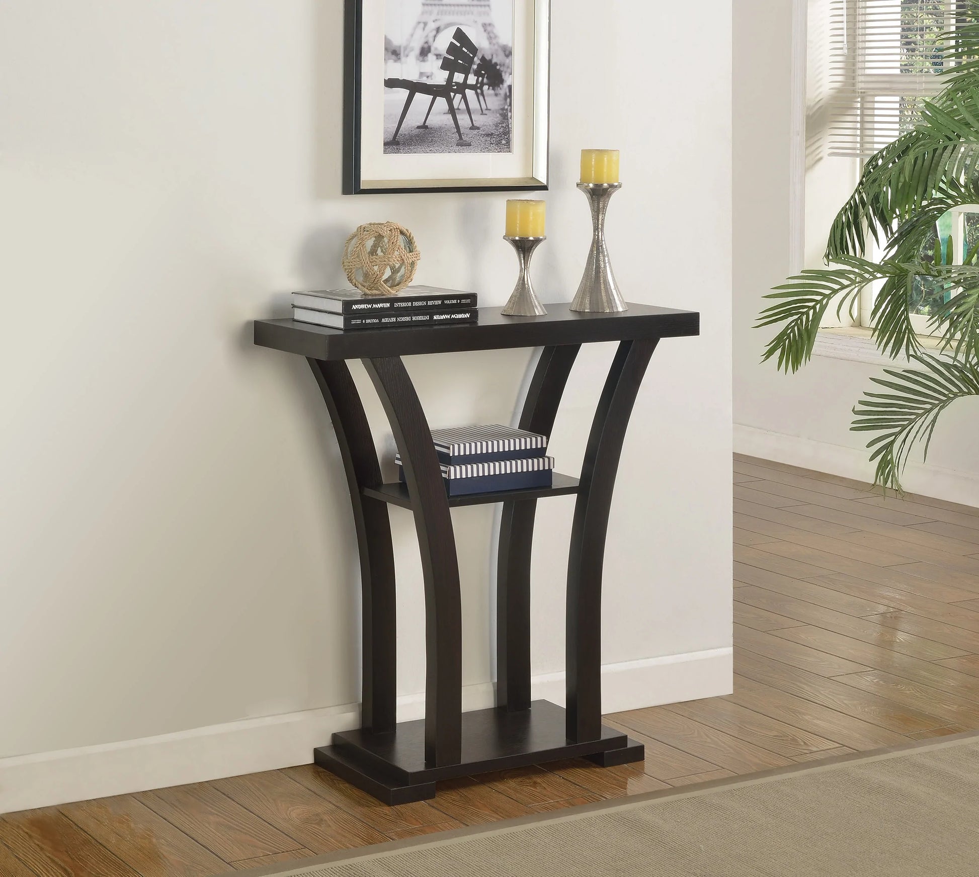 Console Table Comes in Espresso or Grey Finish 31.6"W x 11.6"D x 34"H Its contemporary look creates an inviting atmosphere to any room or setting. With added shelves and drawers, it provides plenty of storage while taking up minimal space.
