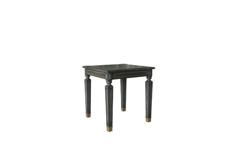 - The Acme Furniture House Marchese End Table features a Tobacco finish, square top, and gold trim and leg accents. Supported by a robust wooden construction, this piece is a perfect addition to any room.